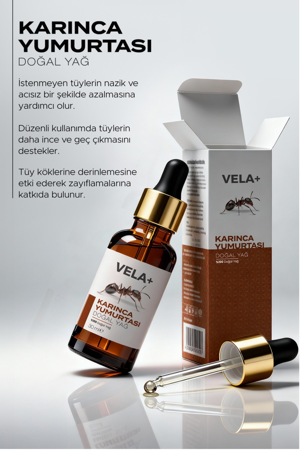 Karınca yağı, doğal içerikli bir bakım yağıdır. Tüy köklerini besleyerek zayıflatır, düzenli kullanımda istenmeyen tüylerin azalmasına yardımcı olur.